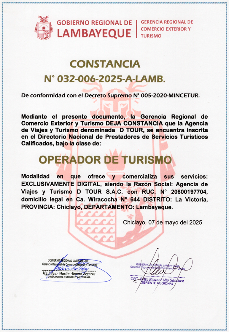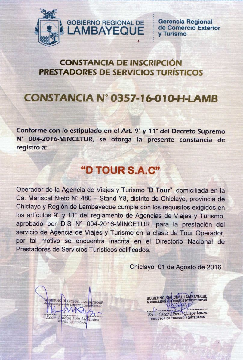 Porsupuesto, contamos con todas las credenciales otorgadas por GERCETUR Lambayeque y estamos debidamente insritos en el padrón de presatdores de servicios turísticos del MINCETUR.