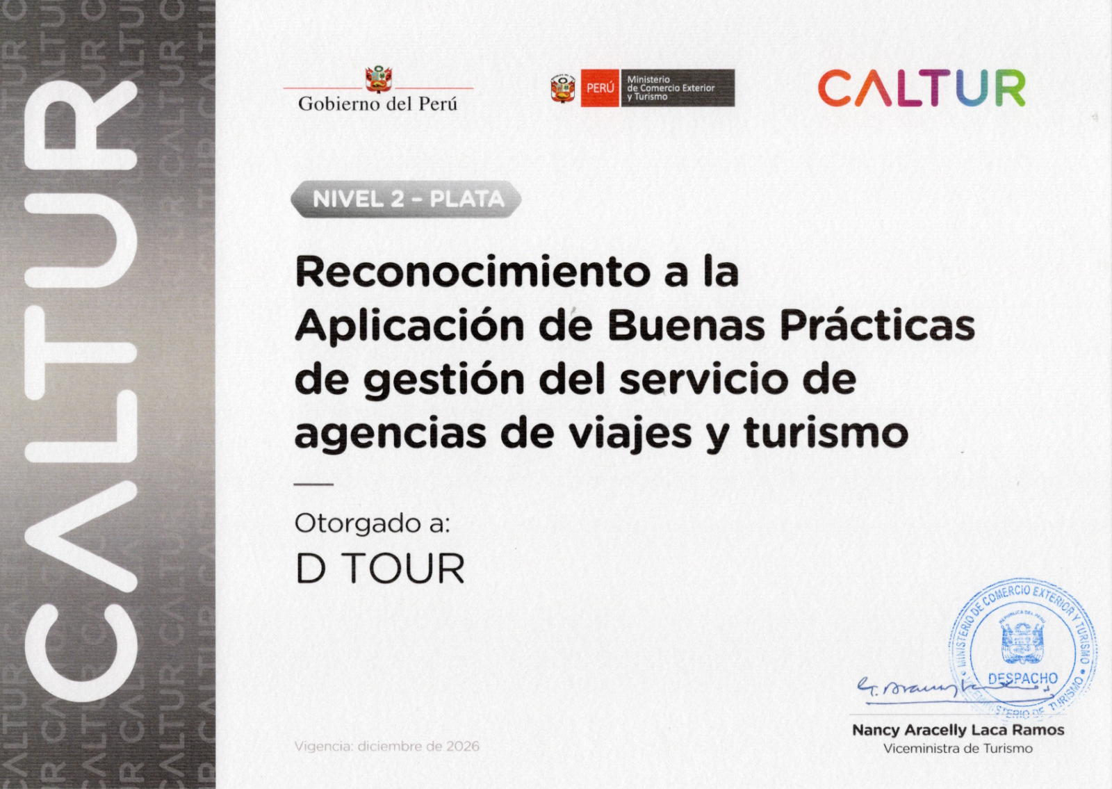 Sí. D Tour S.A.C. cuenta con el Reconocimiento a la Aplicación de Buenas Prácticas de Gestión del Servicio de Agencias de Viajes y Turismo – Nivel Plata, otorgado por CALTUR, iniciativa del Ministerio de Comercio Exterior y Turismo (MINCETUR) y el Gobierno del Perú.